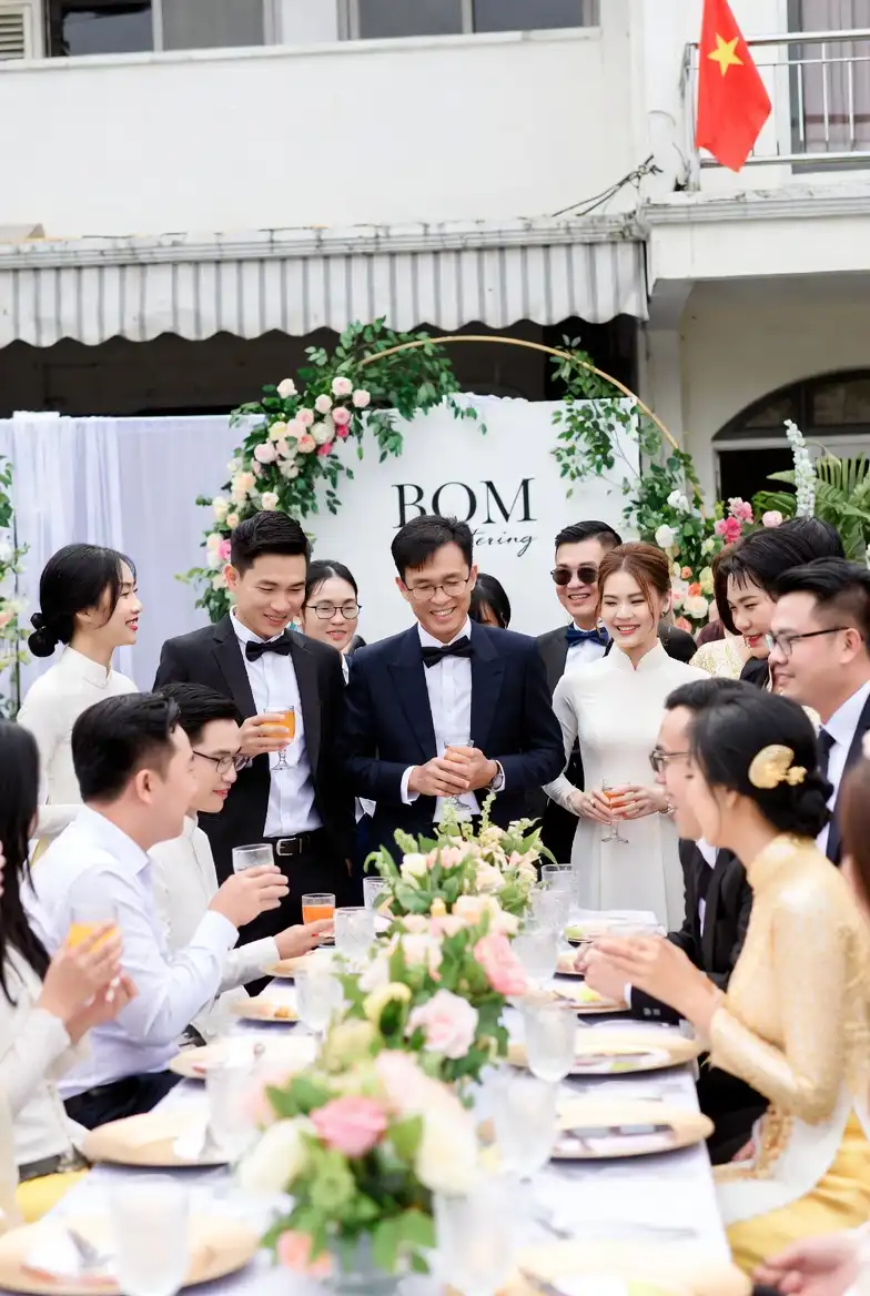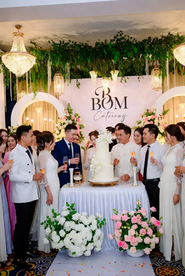 Bàn tiệc được trang trí cầu kỳ với hoa tươi, ly rượu pha lê, khăn ăn gấp nghệ thuật. Mỗi chi tiết nhỏ đều được chăm chút để tạo nên tổng thể hoàn hảo. Không gian và thực đơn kết hợp hài hòa tạo dấu ấn đặc biệt cho ngày trọng đại.